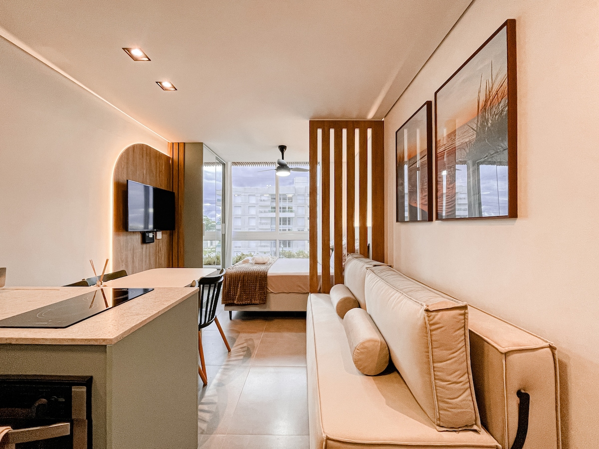Este lugar único tem um estilo próprio, charmoso, novinho, todo climatizado, camas box no conforto ideal e no rooftop uma piscina e vista de tirar o fôlego. (Piscina coletiva somente até 31/03/26). Após esta data não estara mais disponível para uso. Prédio a 80 metros da praia. Lavanderia 24 horas a 200 metros. Restaurantes a 200 metros. Banrisul a 300 metros. Farmácia e supermercado a 300 metros. Venha desfrutar de sossego e praticidade. Suas férias merecem este espaço!