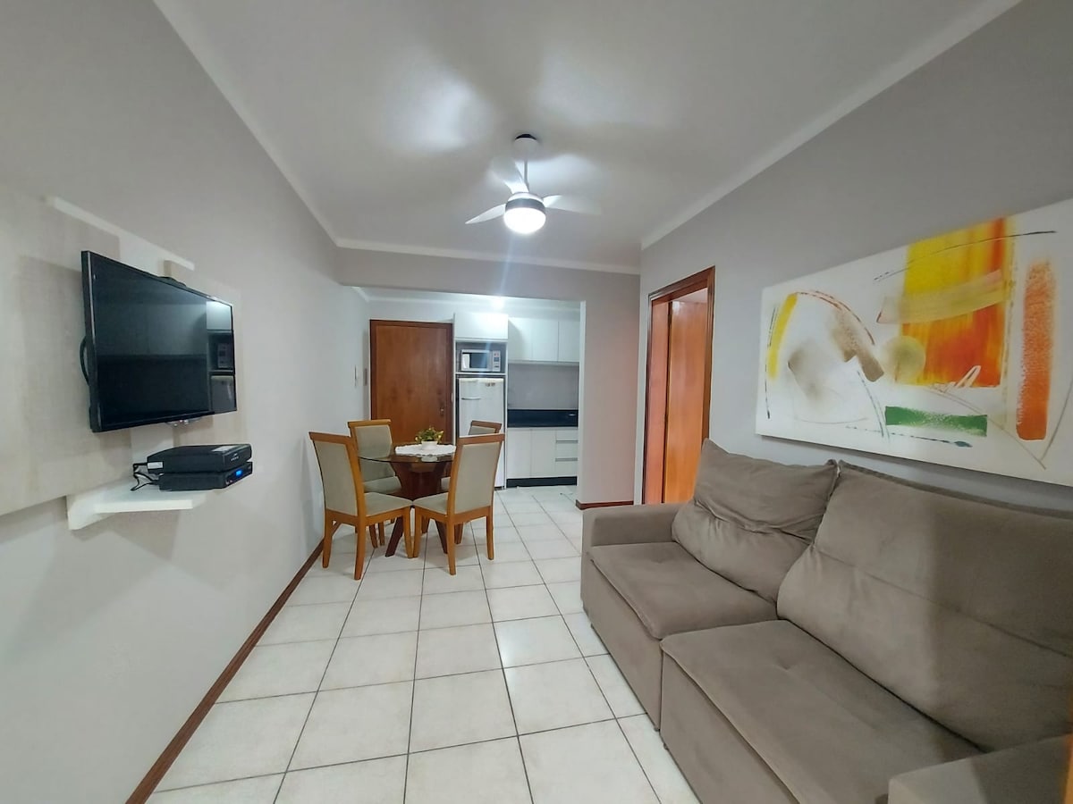 Di samping pusat kota! Apartemen dengan 1 kamar tidur, ruang tamu, dapur, kamar mandi, menampung 4 orang, Wi-Fi, mesin cuci, TV, microwave, barbeku, AC di kamar tidur, lift, tempat parkir untuk 1 mobil, 2 blok dari laut. Tempat ini memiliki tempat tidur double dan 3 kasur single. Seprai tempat tidur dan kamar mandi tidak tersedia.