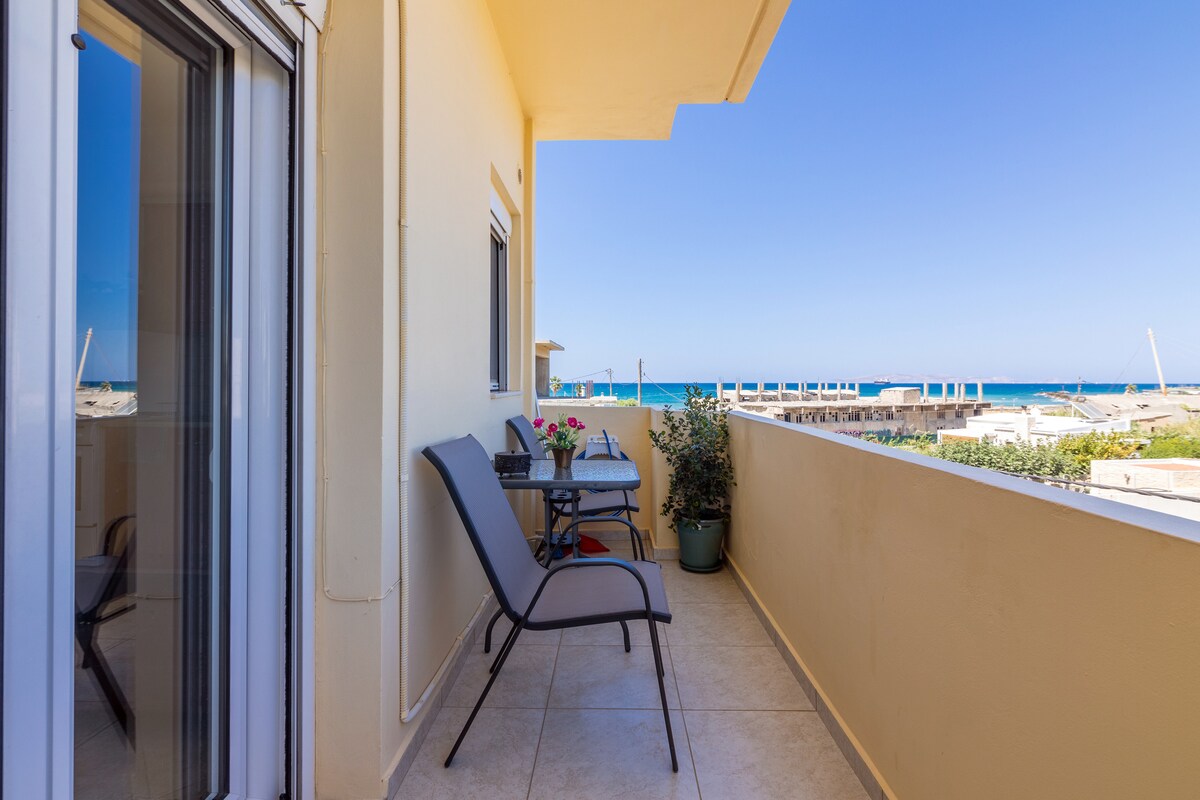 Bask by the Beach in a Chic Apartment Overlooking the Sea. Enjoy breathtaking sunsets from this modern apartment just steps away from Ammoudara beach. Start your day with a swim or relax on the balcony with a sea view. Traditional Cretan lace and artwork add a touch of folklore to the stylish interior. The house is fully equipped with everything you need, including a kitchen and modern amenities like Wi-Fi, air conditioning, and a TV. Take a short drive og 10 minutes to Heraklion city center.