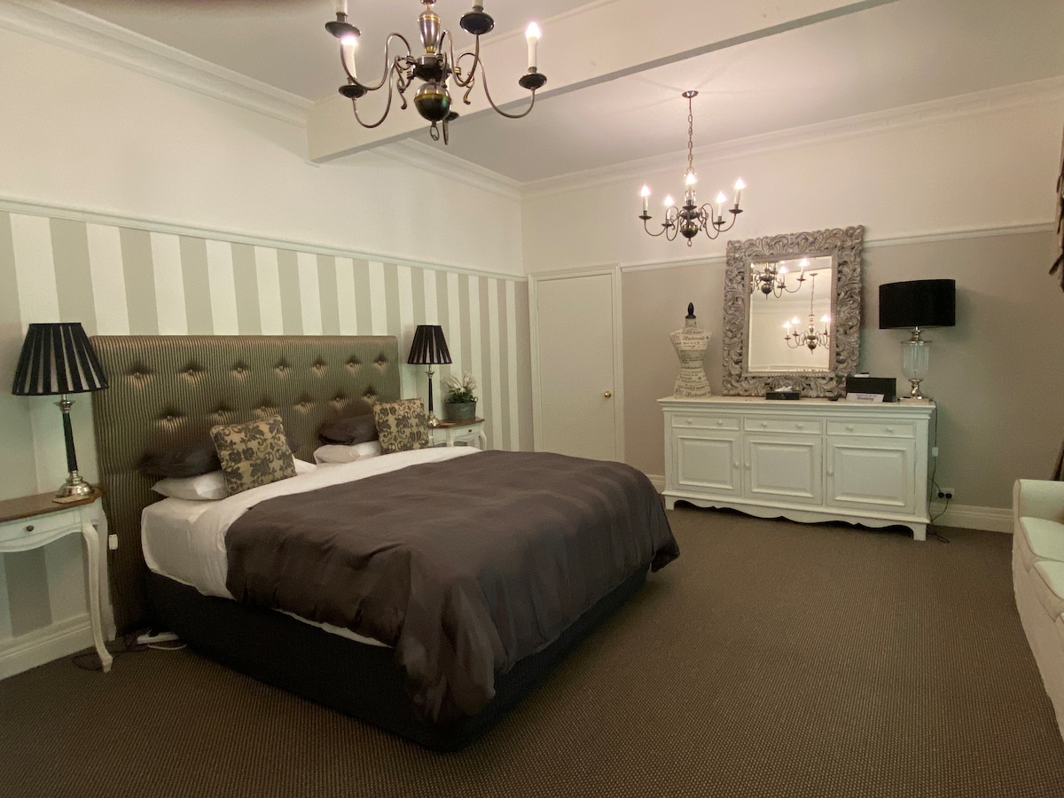 Akomodasi butik yang indah. Guesthouse bergaya warisan budaya kami, yang terletak di 2 hektar terpencil, hanya berjalan kaki sebentar ke kota. Fasilitas bergaya resor termasuk spa, spa berenang, dan sauna. Suite besar Anda adalah salah satu dari 4 yang kami tawarkan semua dengan ensuites mereka sendiri, termasuk pemandian spa ganda yang lezat. Sarapan kontinental dengan memasak daging asap dan telur Anda sendiri disertakan. Anda memiliki akses bersama dengan tamu lain ke ruang duduk, ruang makan, balkon luar ruangan, BBQ, dan dek kolam renang. Tidak cocok untuk anak - anak.