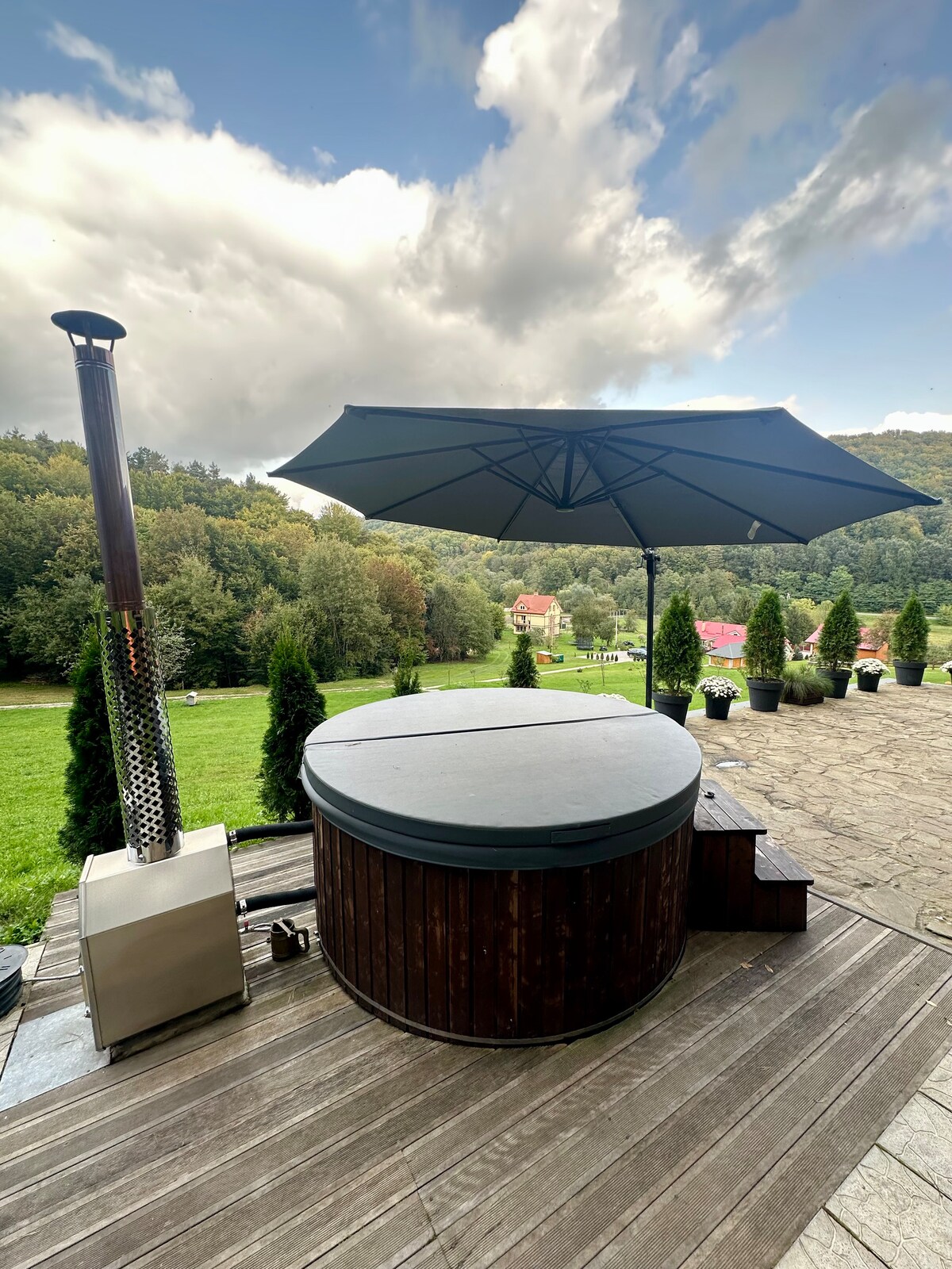 Pondok nyaman dengan bak mandi di teras besar dekat hutan 🌲 Bebaskan diri dari hiruk-pikuk kota dan nikmati liburan yang santai di pondok kami di Desa Maidan, yang hanya berjarak 30–40 menit dari Lviv. Fitur utama rumah ini adalah teras besar dengan pemandangan langit, tempat Anda bisa bersantai di air hangat, menikmati ketenangan, alam, dan suasana relaksasi penuh ✨ 2 kamar tidur terpisah Aula Besar dengan Perapian untuk Kayu Bakar Dapur dengan semua peralatan memasak yang diperlukan Area barbeku dengan kayu bakar🔥