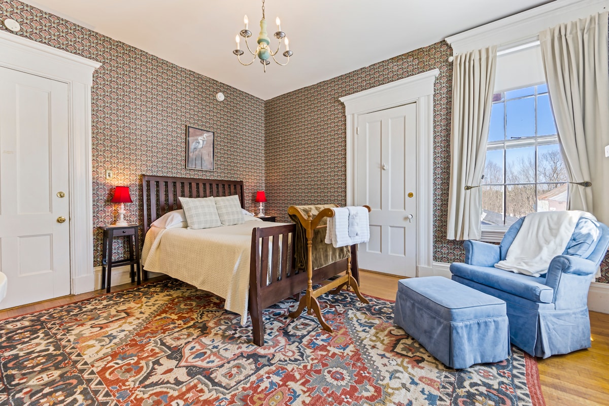 Kamar unik ini berada di rumah peternakan tahun 1820 - an. Lantai pinus lebar asli, jendela langit khusus dengan perabot antik dan reproduksi menonjolkan ruang ini. Pintu antik geser menyembunyikan kamar mandi en suite dengan pancuran berdiri. AC akan membuat Anda tetap sejuk pada malam yang hangat. Tempat tidur queen memiliki kasur merek mewah, jadi Anda harus menikmati tidur yang nyenyak. Sarapan "layani diri sendiri" yang ringan menanti di pagi hari. Kamarnya berada di lantai 3. (TIDAK aksesibel bagi penyandang disabilitas).