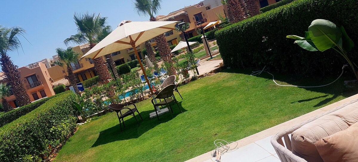 A beautiful, cozy chalet 2nd row in Lavista 1 full sea view. The chalet is 3 min walk from the beach. The chalet has 3 bedrooms that could sleep 7 guests as well as an extra foldable bed and 3 big couches in the living room. The house is fully air-conditioned with AC in every room. The kitchen is fully equipped will everything you will need. There's also s a private garden with a private fence. The compound has 2 lagoons and 4 swimming pools that guests are welcome to use.
