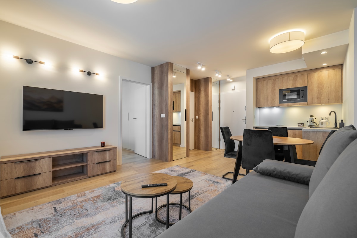 AquaPark ONE flat is an excellent choice for families and groups of friends who want to spend time in the very centre of Zakopane, in the immediate vicinity of the water park and only 5 minutes from the famous Krupówki. From the terrace of the apartment you can admire the Giewont peak. The apartment is located in a modern apartment building.