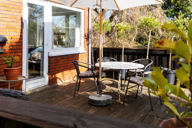 Natur og stor træterrasse i solen