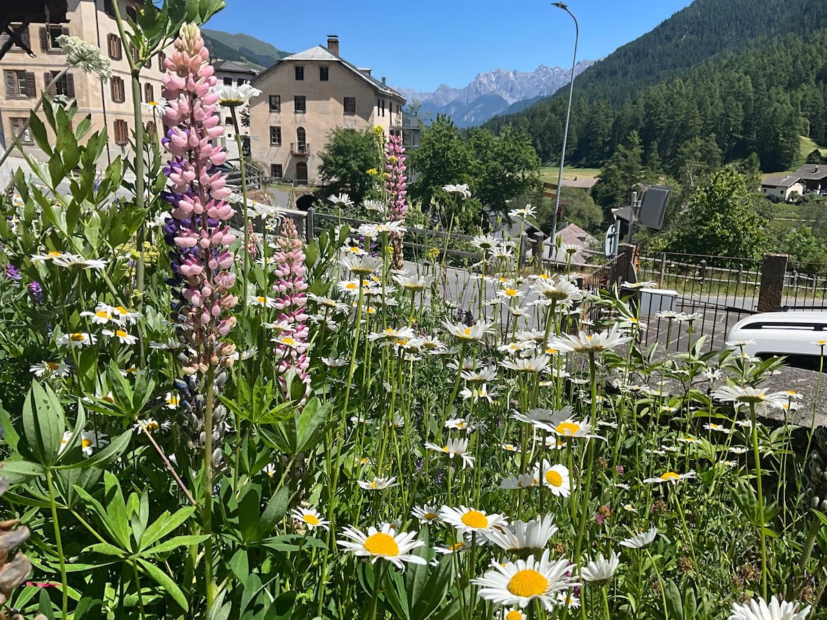 Apartemen kecil (kamar tidur, ruang tamu, ruang makan (tanpa kompor memasak), shower/toilet) di rumah pertanian berusia 400 tahun ini dekat dengan stasiun kereta Ardez. Ada banyak peralatan antik di rumah dan di apartemen ini. Anda akan sangat menyukai tempat saya karena bakatnya di masa lalu, dilengkapi dengan semua kenyamanannya. Area parkir gratis tersedia untuk tamu kami di dekatnya.