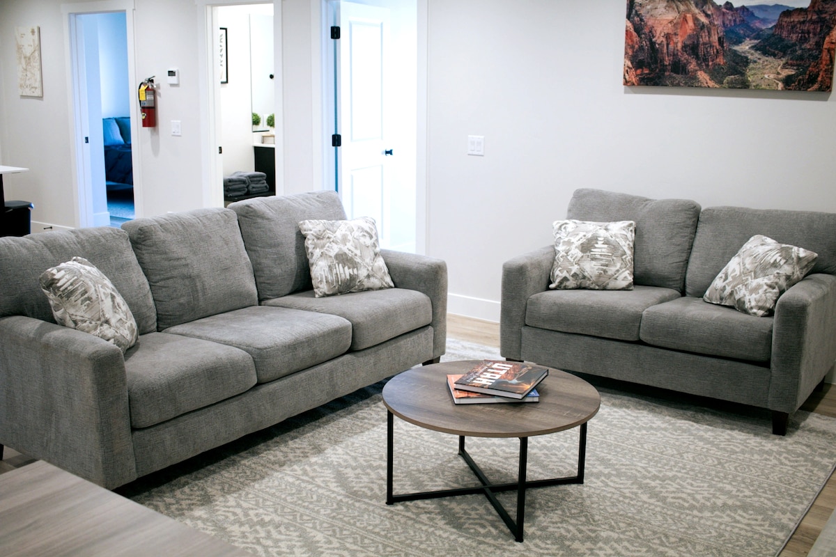 Dekat dengan Zion Park, ULASAN TAMU kami menceritakan kisah kami dengan baik. Kami memiliki suite seluas 1.250 kaki persegi yang indah yang dilengkapi dengan BAK MANDI AIR PANAS PRIBADI serta pintu masuk pribadi, patio & area halaman dengan air terjun. Ruang ini adalah ruang bawah tanah yang bisa keluar dari rumah kami & memiliki pintu masuk tanpa kunci, 2 kamar tidur, masing-masing dilengkapi TV 55 inci, dapur kecil, area duduk dengan TV 65 inci, mesin cuci dan pengering besar & kamar mandi 2 kamar. Di luar terdapat lubang api gas & pemanggang Blackstone. Dirancang untuk hingga 4 orang. Maaf, dilarang merokok atau membawa hewan peliharaan.